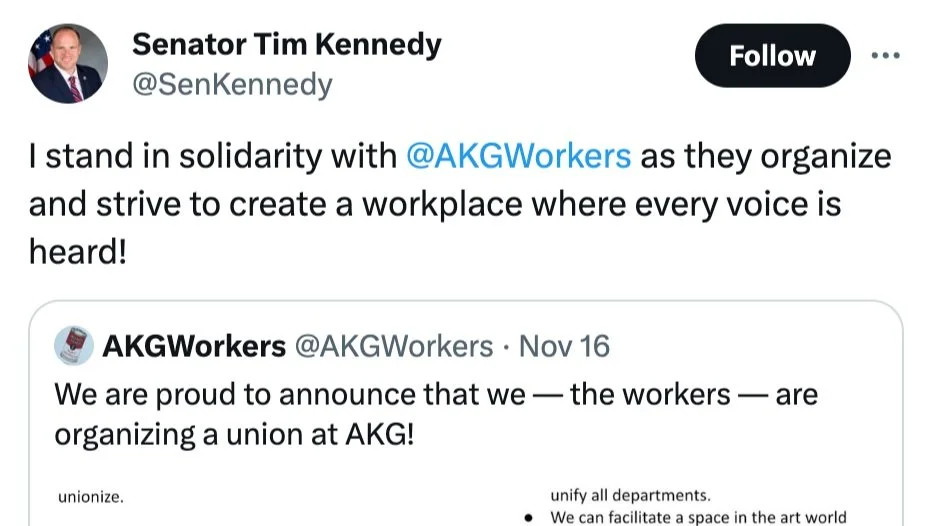 Senator Tim Kennedy has stepped forward in solidarity with AKG Workers United, endorsing their unionization efforts aimed at fostering an inclusive workplace where every voice is valued and heard.